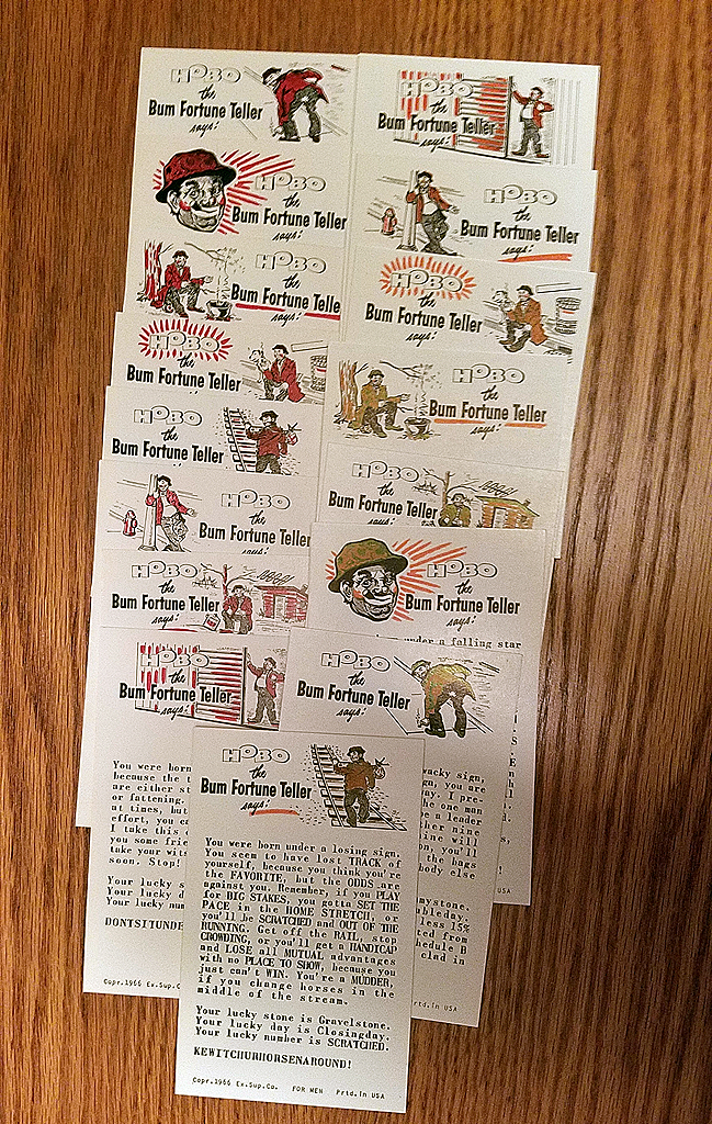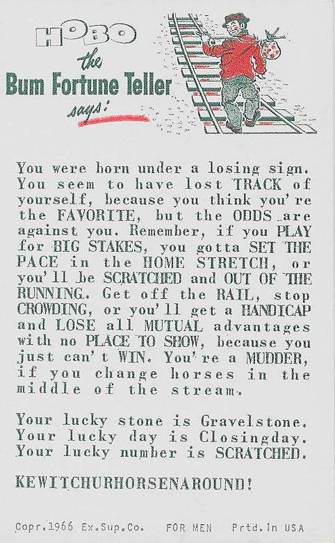All of the cards begin with the phrase "Hobo the Bum Fortune Teller says: "