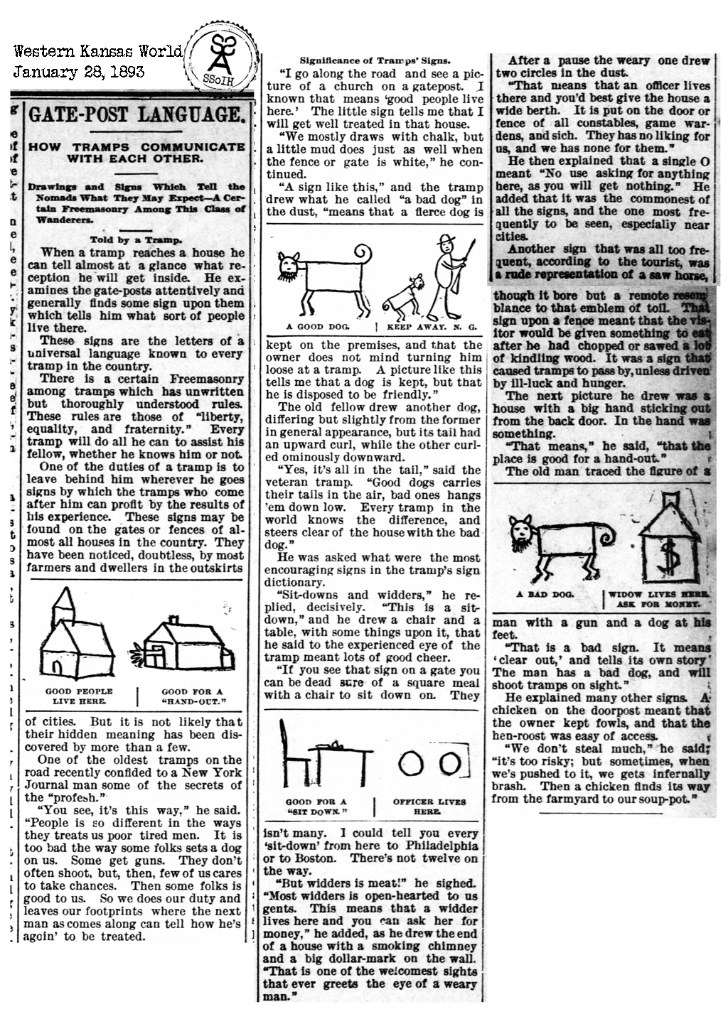 Gate-Post Language. The article discusses several hobo signs however we feel the artwork is a little more detailed than most hobos would have produced. WaKeeney, Kansas. Jan 28, 1893. ( CTRL-Mouse Wheel will zoom ) |
