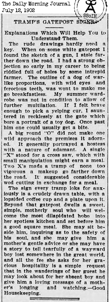 Tramp's Gatepost Signs. This article talks about an X which stood for a cross saw and two, XX stood for considerable wood cutting. This was from Good Housekeeping. July 12, 1902. | Source Image |
