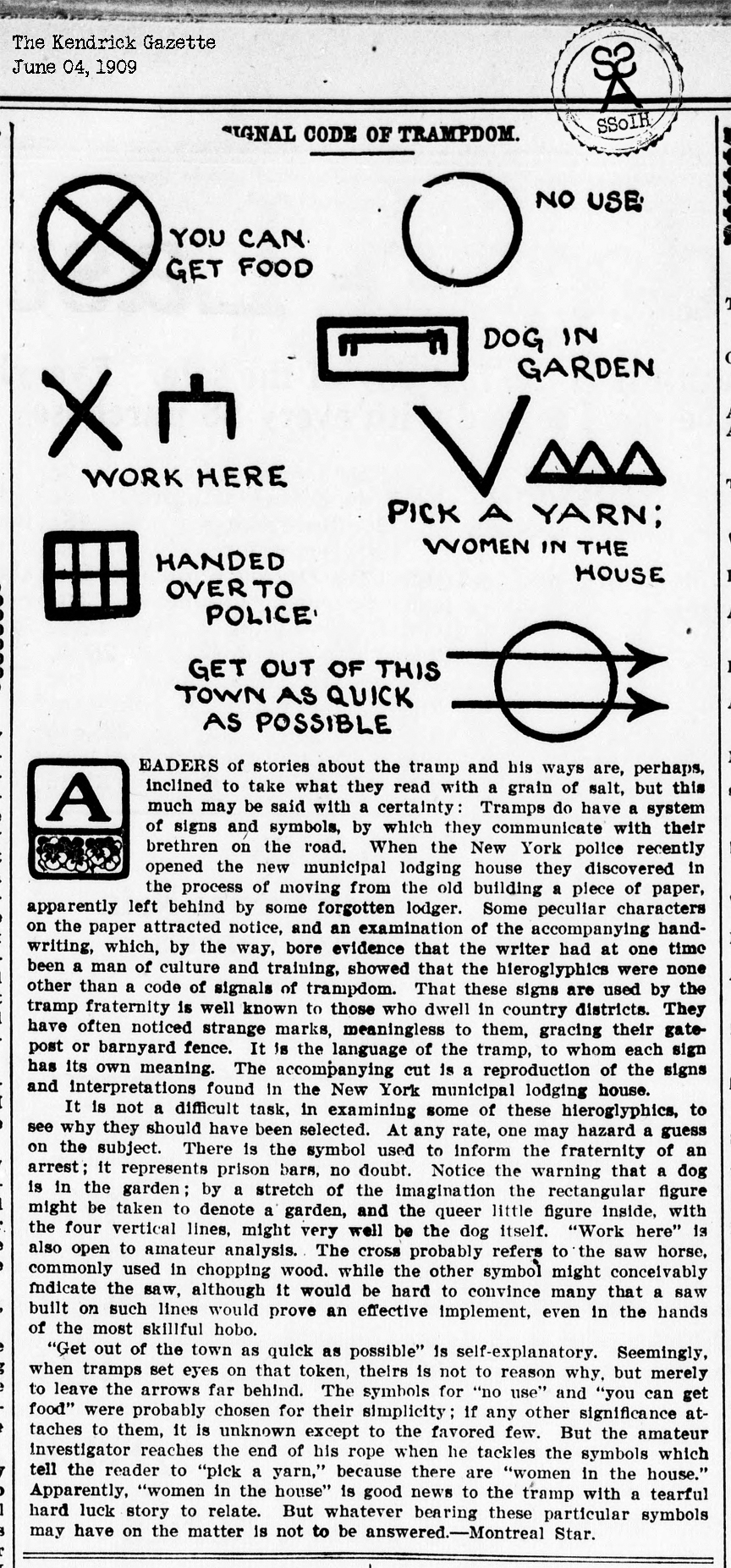 the people and the availability of work, food and lodging. The only way of passing knowledge of these signs between hoboes was word of mouth.
