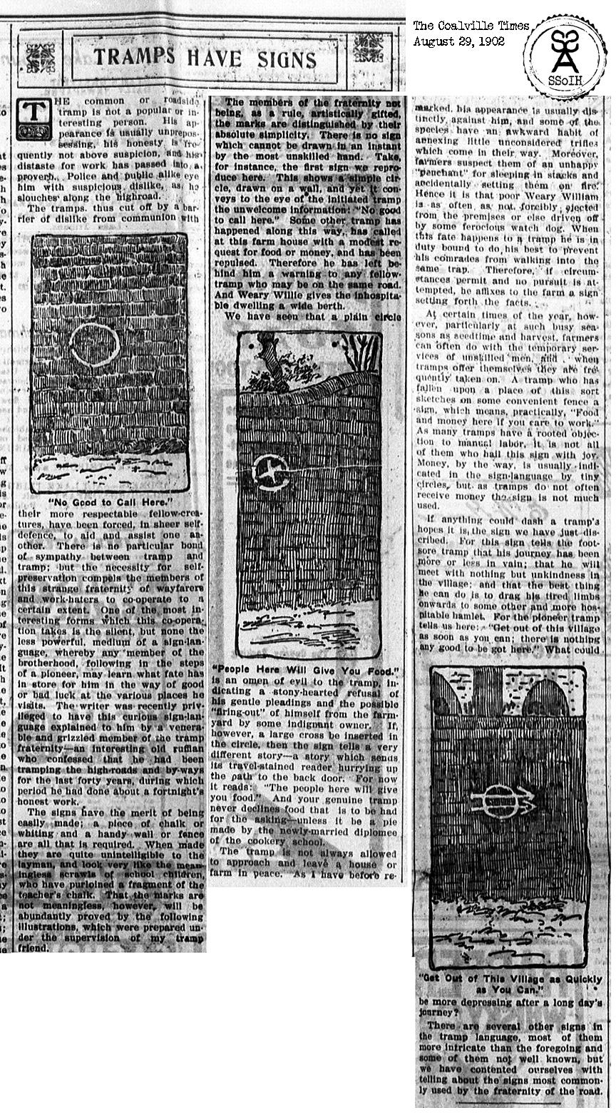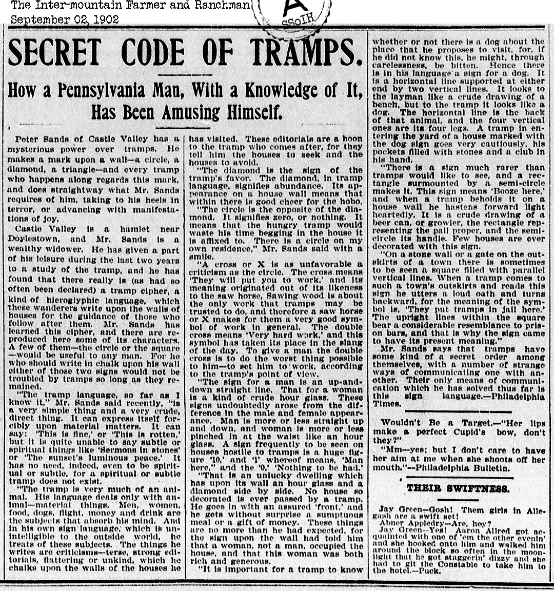Tramps Have Signs. Another article of the times discussing hobo signs. Coalville, Utah. Aug 29, 1902 ( CTRL-Mouse Wheel will zoom ) |