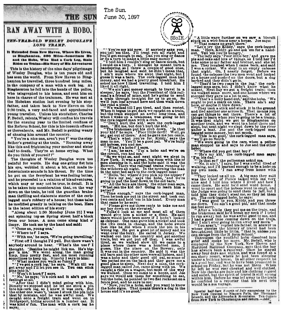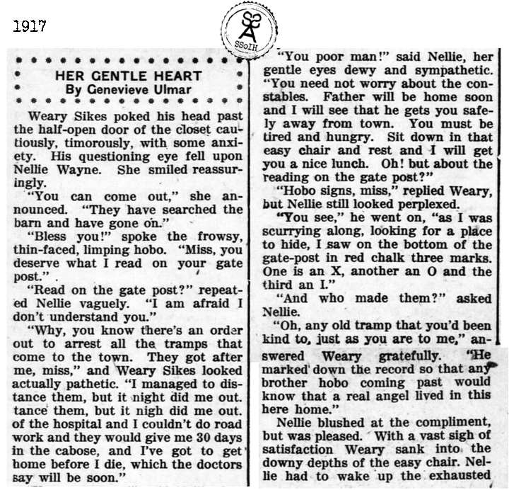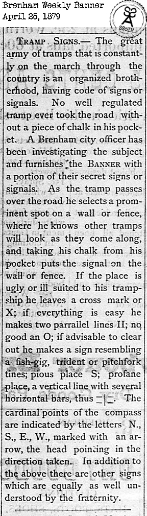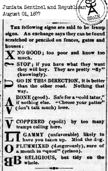Ran Away With A Hobo - Kid runs away with a hobo. Two rocks on a fence post meant there's a dog in the house and it's not good. A biscuit on a wire fence meant no graft there. Two sticks making a cross means you can get things to eat here. Eastcoast - The Sun - June 30, 1897 | Source Image |
