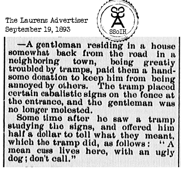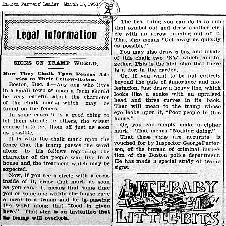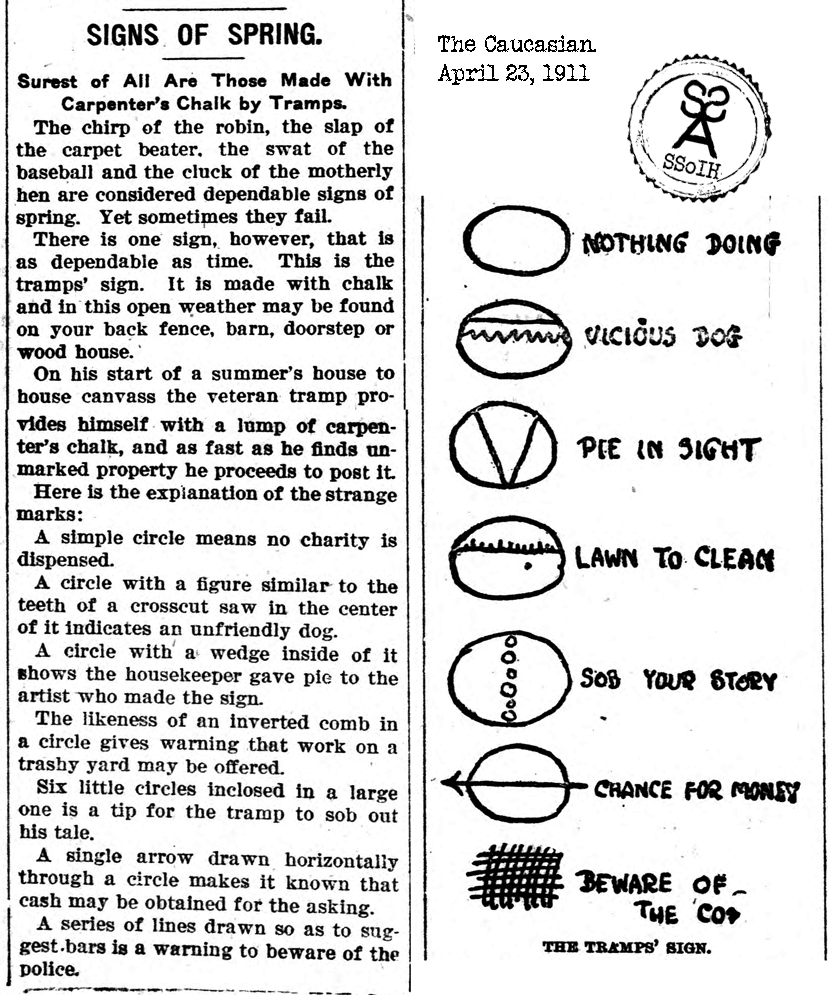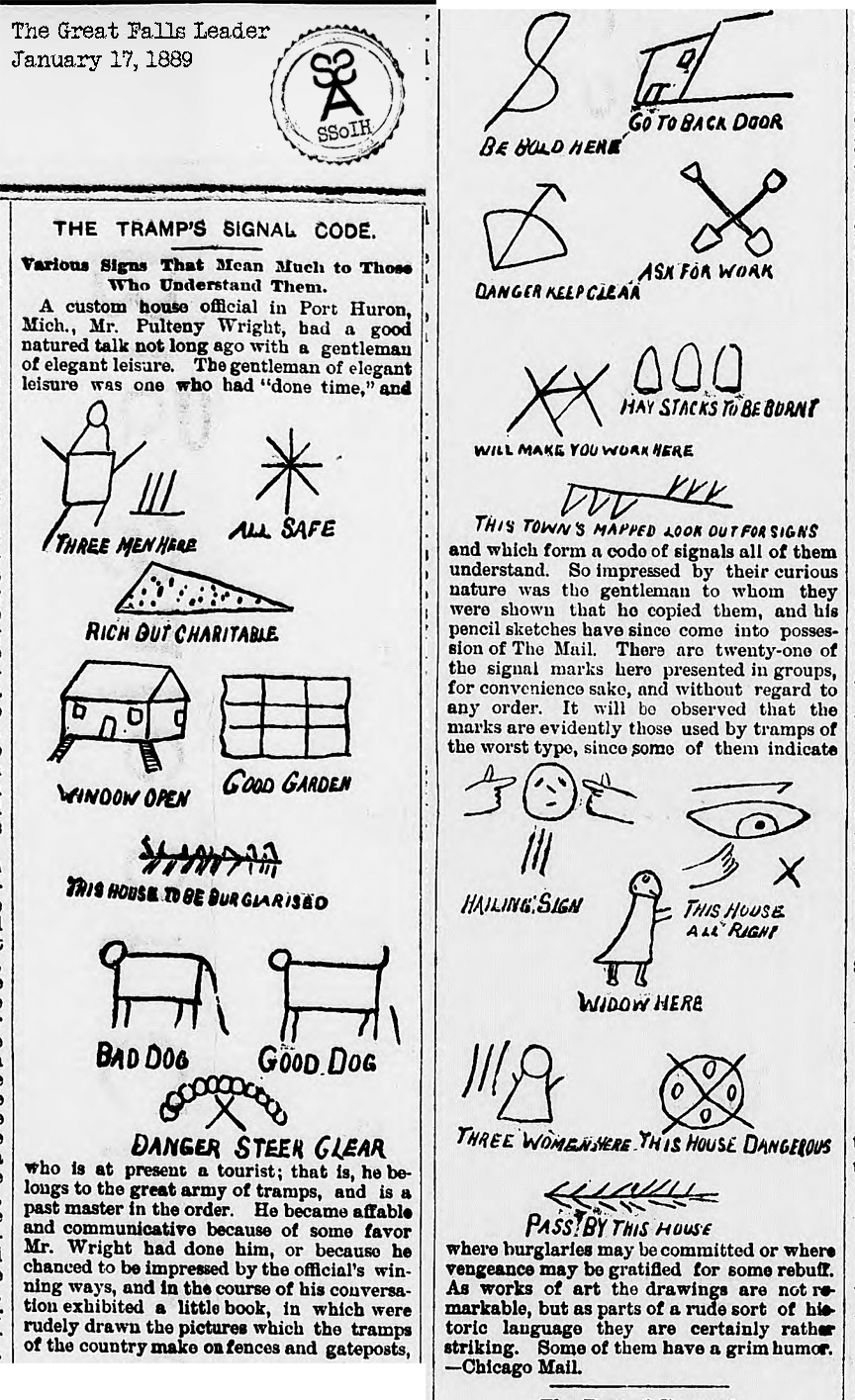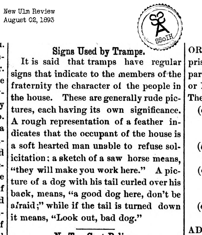 Signs Used by Tramps. Feather = Soft hearted man unable to refuse solicitation. A Saw Horse = they will make you work here. The good and bad dog symbols are discussed in the article. New Ulm, Minnesota. Aug 2, 1893 | Source Image |