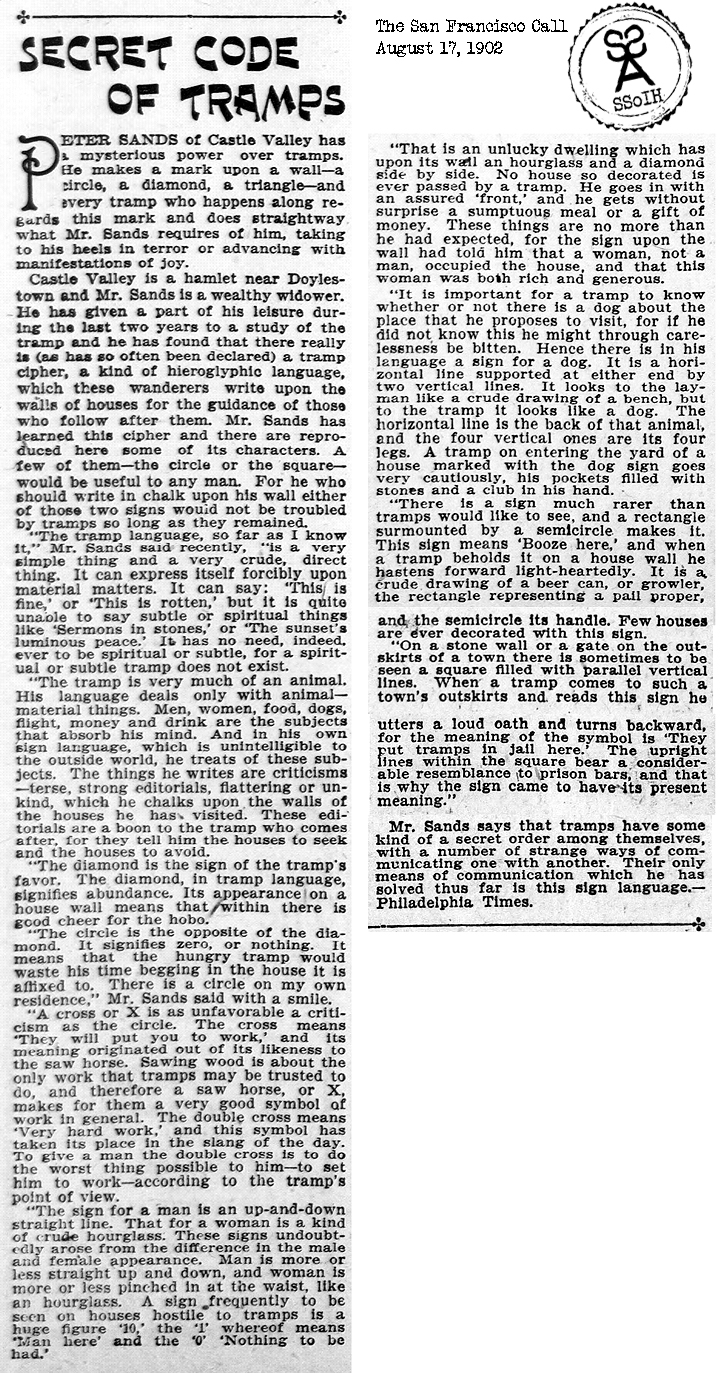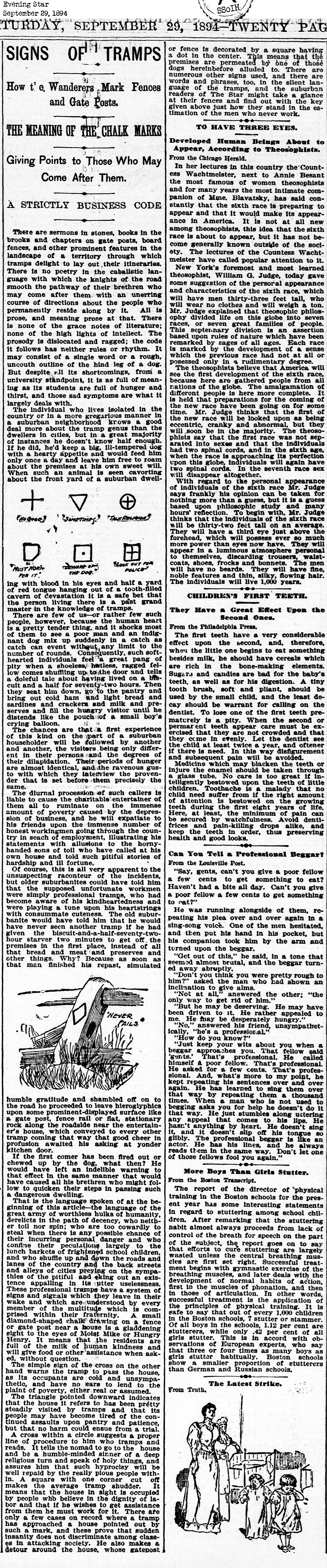 Secret Code of Tramps. Diamond = good cheer for the hobo, O = zero, nothing. X = work and XX = very hard work. Other symbols are discussed. Philadelphia Times. Aug 17, 1902 ( CTRL-Mouse Wheel will zoom ) |