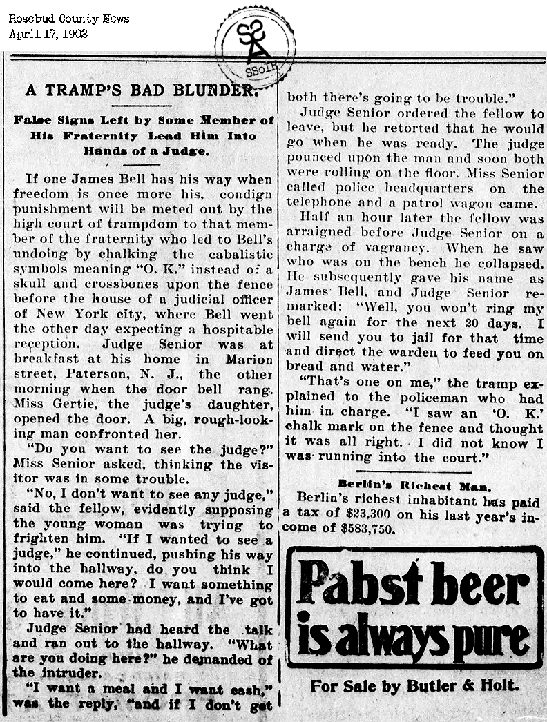 A story of a hobo who was tricked by a false sign placed by another hobo. Rosebud Country, Montana. April 17, 1902 | Source Image |