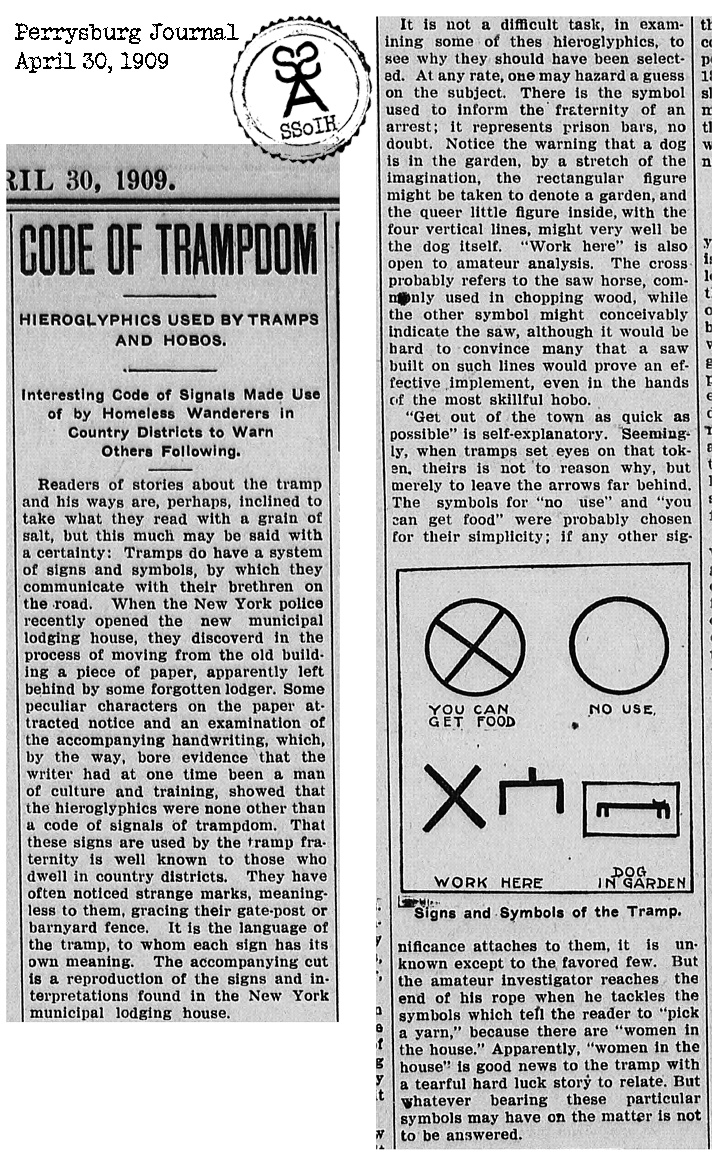 See also: SSoIH's Hobo Signs Database - Over 360 pictorial Hobo Signs.