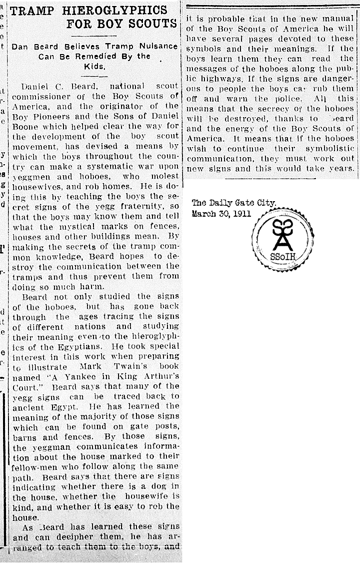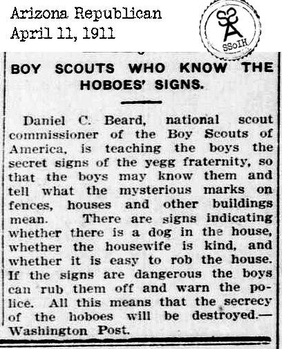 Boy Scouts of America get involved. Scout leader is teaching Scouts to identify hobo signs so they can spot danger and rub them off and alert the police. B.S.A. 1911 Please see all sources to the right ( CTRL-Mouse Wheel will zoom ) |