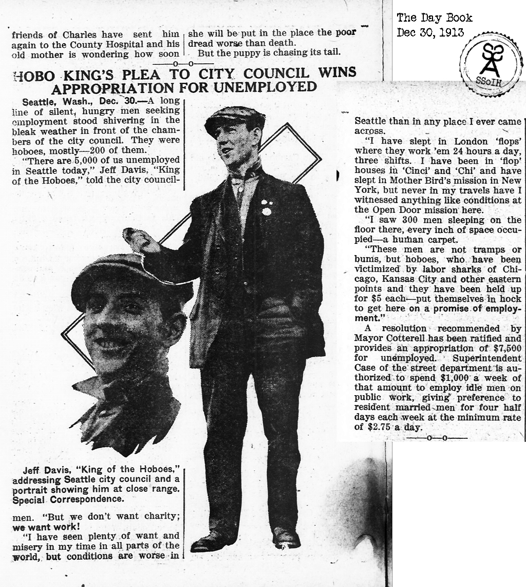 Hobo King Jeff Davis makes a plea to Seattle City Council and wins appropriation for unemployed. - Dec 30,1913 ( CTRL-Mouse Wheel will zoom ) |