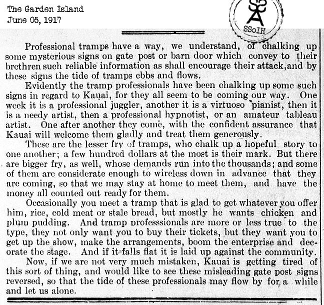 Story about several levels of Tramps coming to Kauia, Hawaii to swindle what they can. Kauia, Hawaii. June 5, 1917 | Source Image |