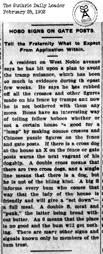 Hobo Signs on Gate Posts. X = cross dog, XX means two cross dogs. Guthrie, Oklahoma. Feb 25, 1902 | Source Image |