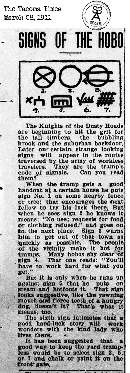 Signs of the Hobo. Get out of town, kind lady, jail, etc. Tacoma, Washington. Mar 8,1911 | Source Image |
