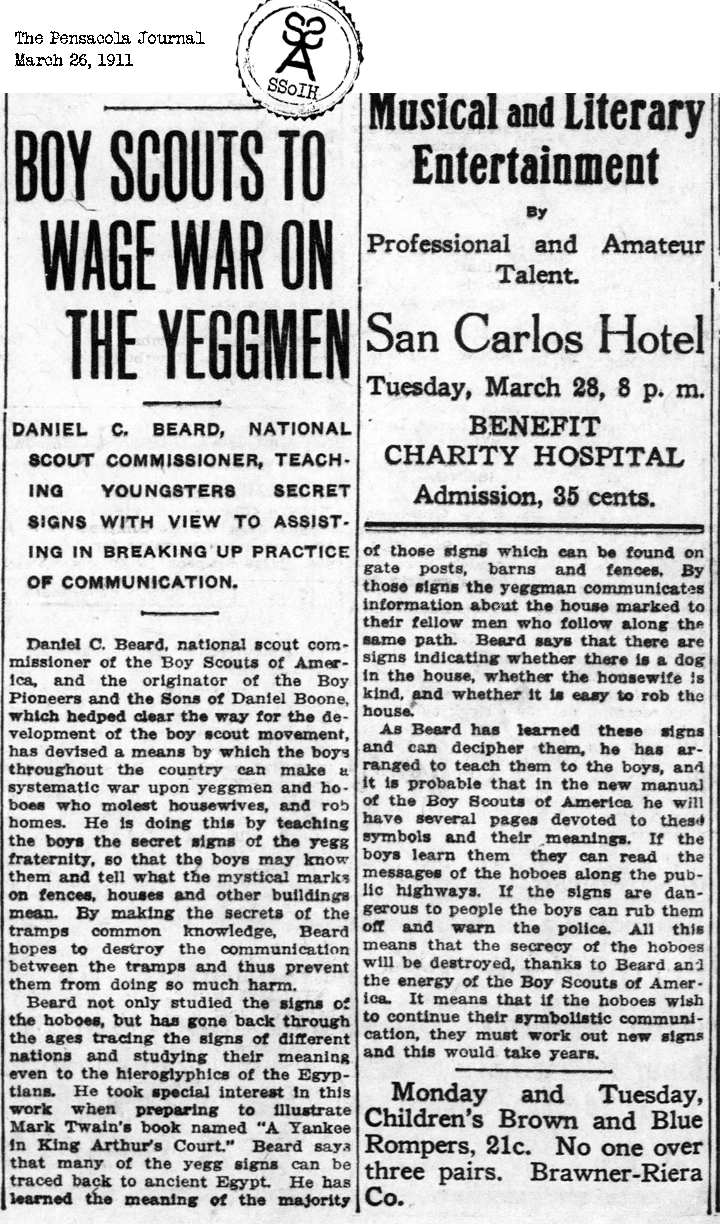 An advertisement for The Pensacola Journal showing hobo signs. The article hasn't been located. Jan 13, 1916 | Source Image |