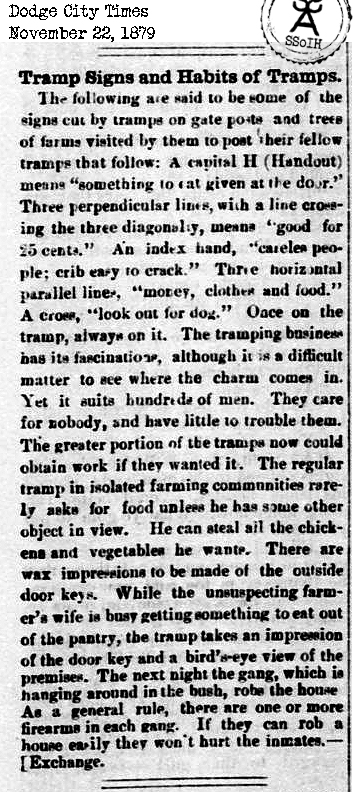 Tramp Signs and Habits of Tramps. ||| = Money, clothes and food, X = look out for dog. The article also references taking wax impressions of outside door keys. Nov 22, 1879. | Source Image |